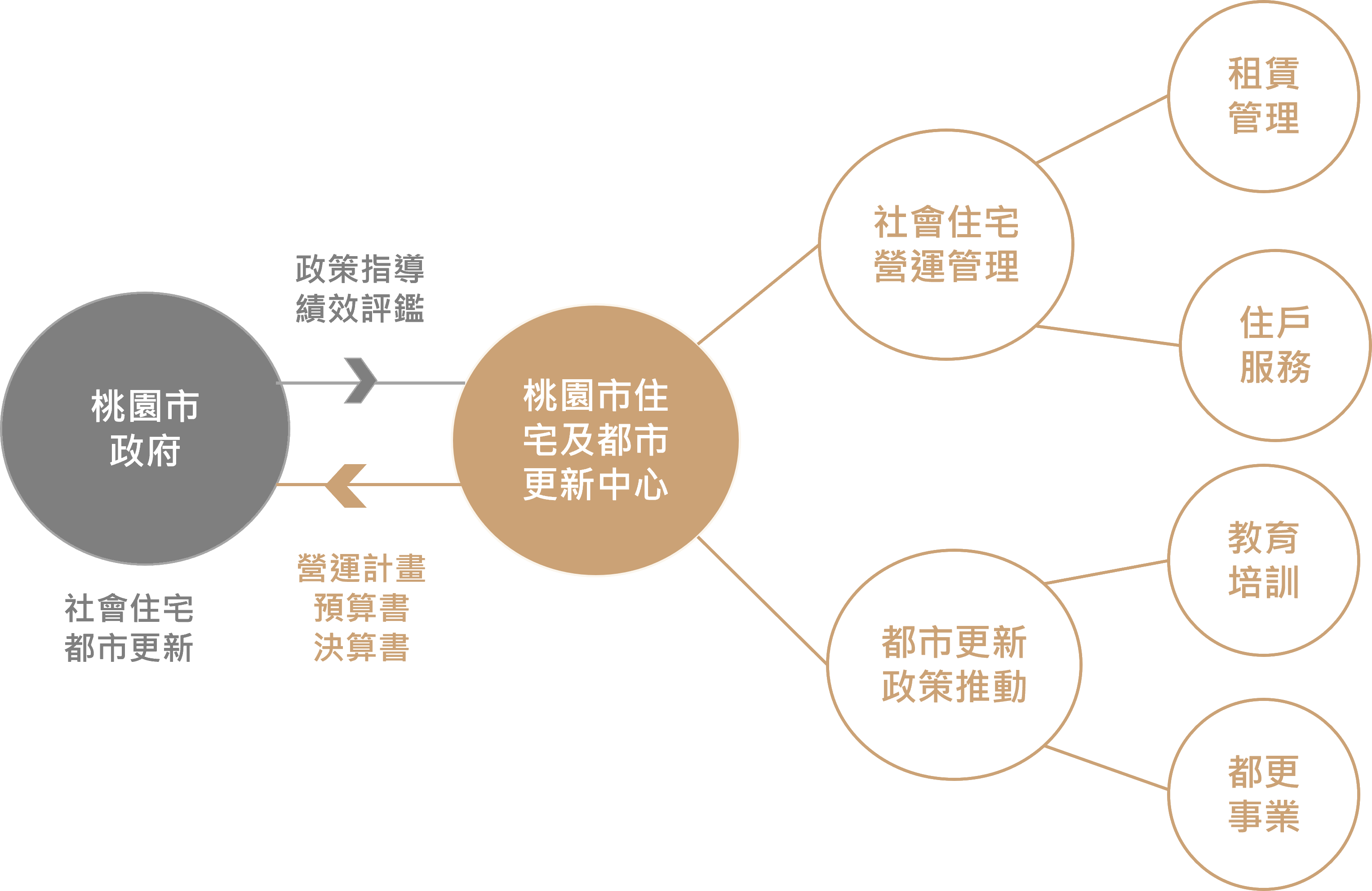 隨著市府住宅政策發展,為擴大都市更新量能,落實都市更新推動,並提升社會住宅管理及服務效能,經113年第3次董事會議(113年 7月17日)決議整併組織,並新增不動產及都市更新相關業務,桃園市市政議會於113年9月25日通過「桃園市住宅及都市更新中心設置自治條例」,並已修法完成,114年4月1日正式更名為「桃園市住宅及都市更新中心」,辦理住宅及都市更新相關業務,以更具彈性的制度及完善的監督機制,達到社會住宅營運管理效能及強化都市更新推動量能,增進公共利益,實踐安家樂業的居住典範。