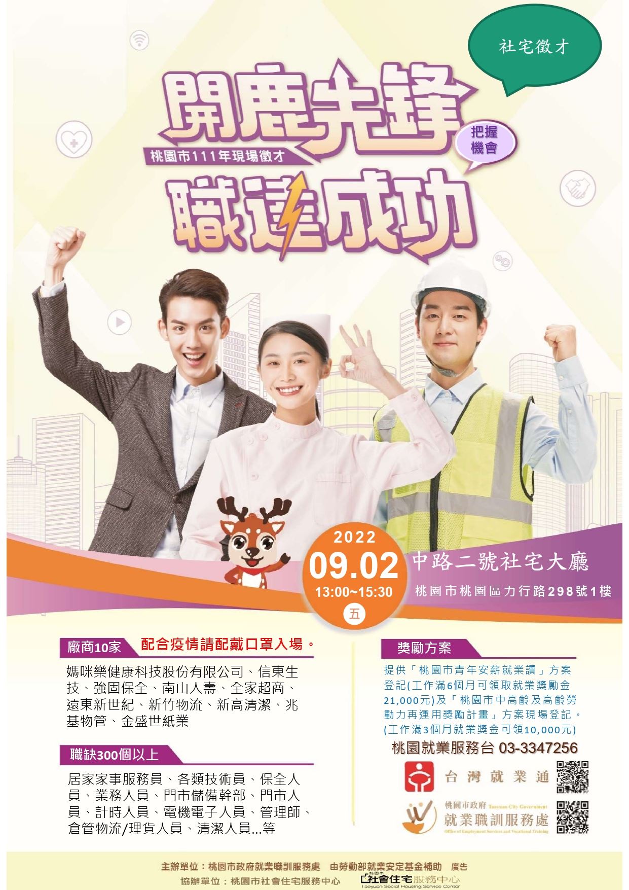 9/2(五)13:00~15:30 中路二號社會住宅辦理「開鹿先鋒 職達成功」現場徵才,多家廠商設攤,現場提供就業徵才服務!!!