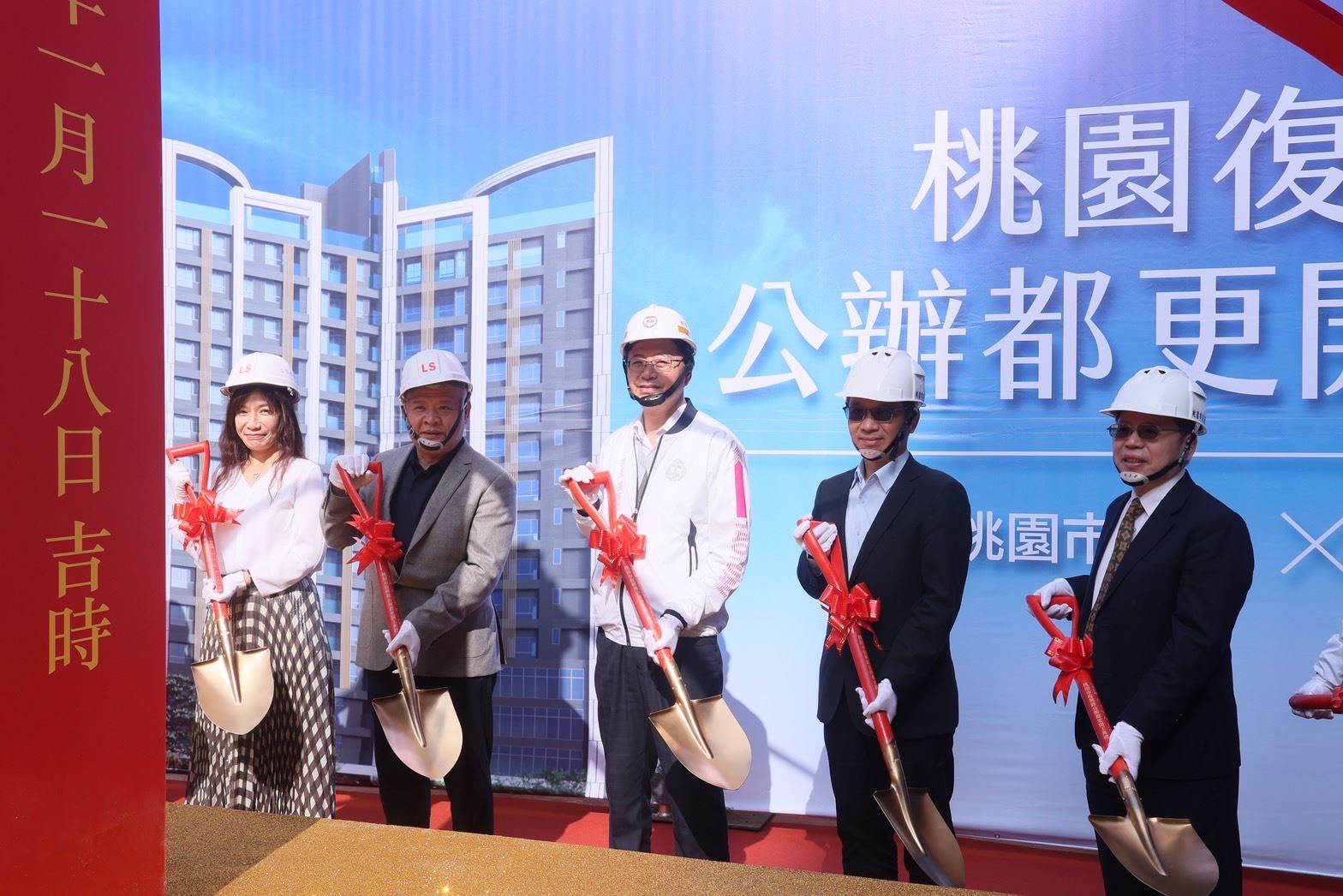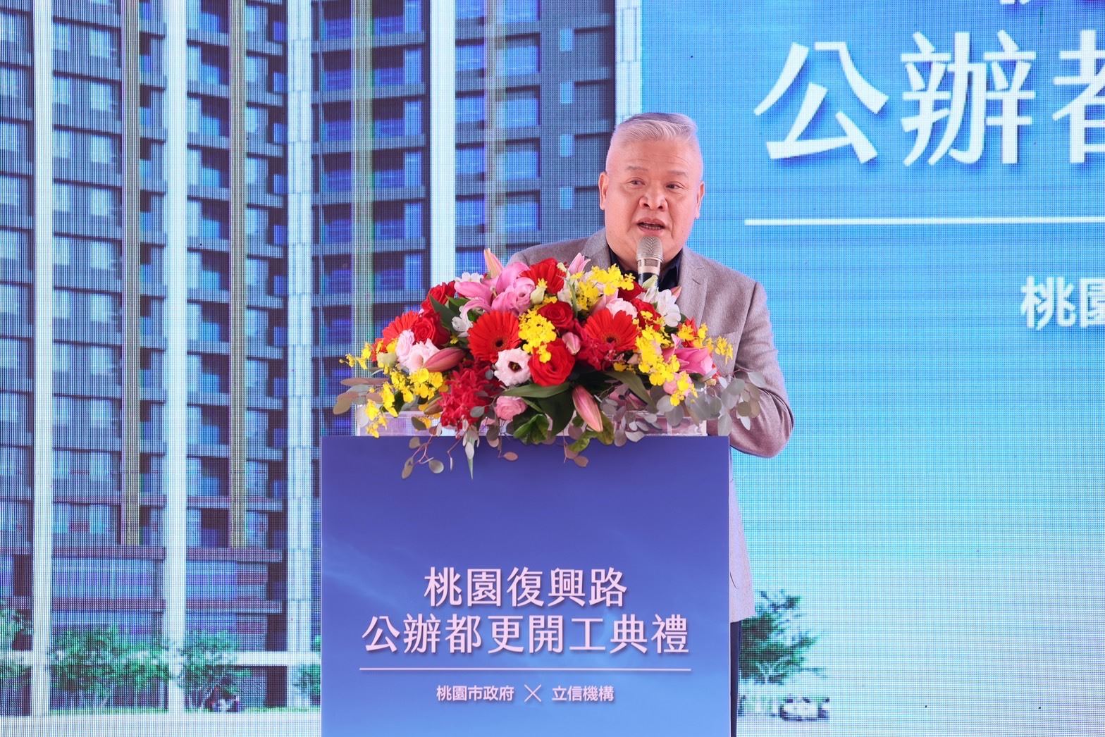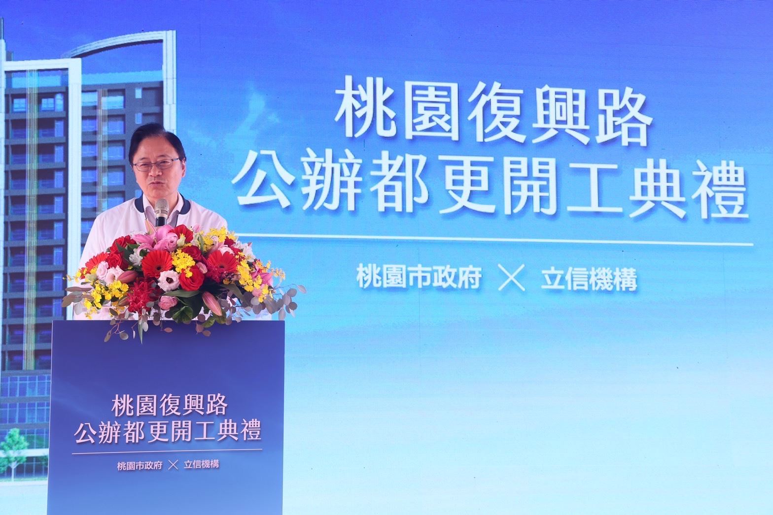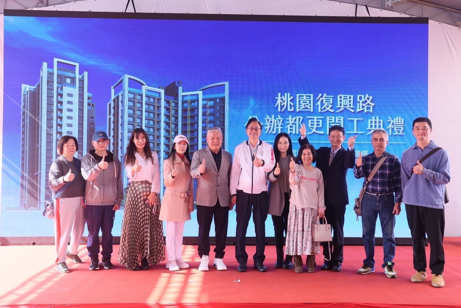 桃園市長張善政今(18)日出席桃園市桃園區復興路公辦都更開工典禮,本案基地位於桃園區復興路及民生路路口,步行至桃園火車站僅需5分鐘,北側鄰東溪綠園道,基地面積達2,663平方公尺,私有土地占4成,實施者為立信機構(立信工營造股份有公司)分別興建地上14層及17層2棟建築物,市府除了分回75戶社宅之外,並可取得740坪公共服務設施。