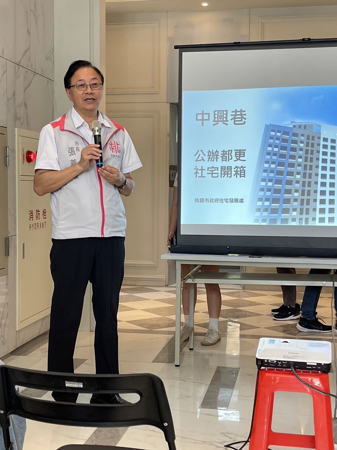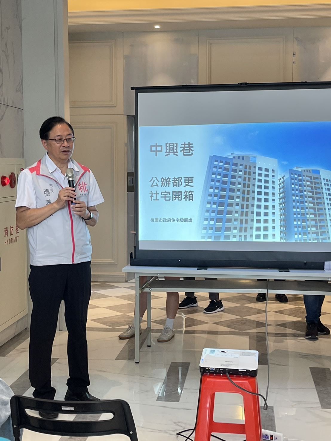 今日包括市議員張曉昀、彭俊豪、舒翠玲、謝美英、市府都發局長江南志、中壢區長李日強、昇陽建設企業股份有限公司總經理魏岱霖、趙志元建築師事務所建築師趙志元、基業室內裝修工程有限公司負責人黃啟原等均一同出席。