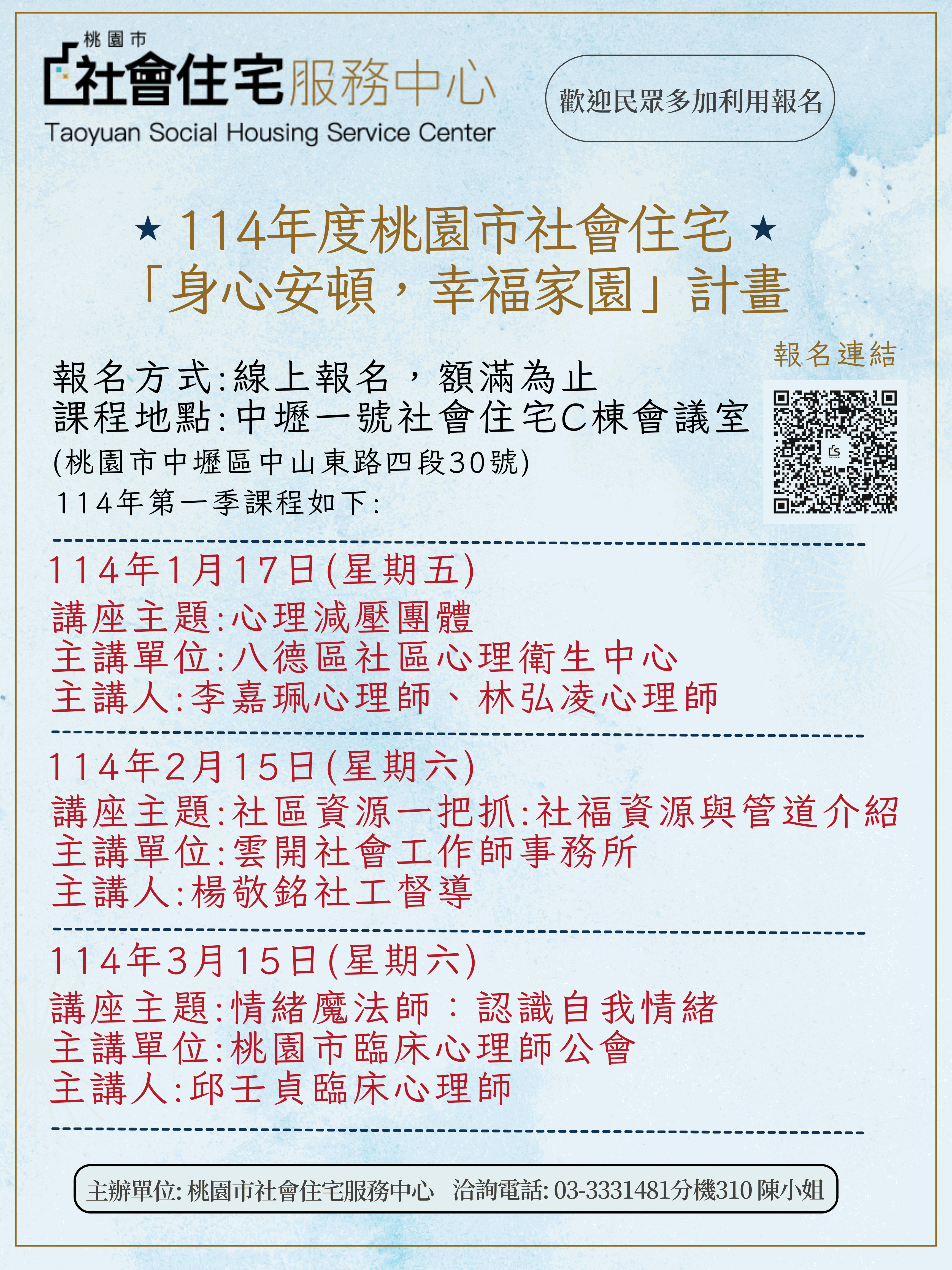 桃園市政府為落實居住正義,積極推動社會住宅政策,不僅積極興建社宅提供安居之所,亦重視住戶的身心健康,特別啟動「身心安頓・幸福家園」計畫,與市府各局處、民間團體及社區組織緊密合作,規劃一系列的課程講座及活動,第一季率先在桃園最大的社宅中壢一號登場,並將持續推動每月一講座課程供民眾報名,歡迎民眾可多踴躍參加。