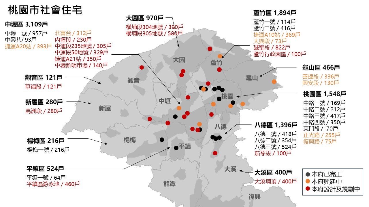 統計桃園已入住和興建、規劃中的社宅,總共有37個基地,包含自建、都更分回,或是跨局處合作興建等,規劃設計對應社宅區位,試地配比合適的需求的房型比,公共空間也廣邀市府各局處合作,導入全齡友善的照護空間,如長者照顧、公共托嬰、社區里民活動中心和弱勢族群支持服務等,成為鄰里的核心。